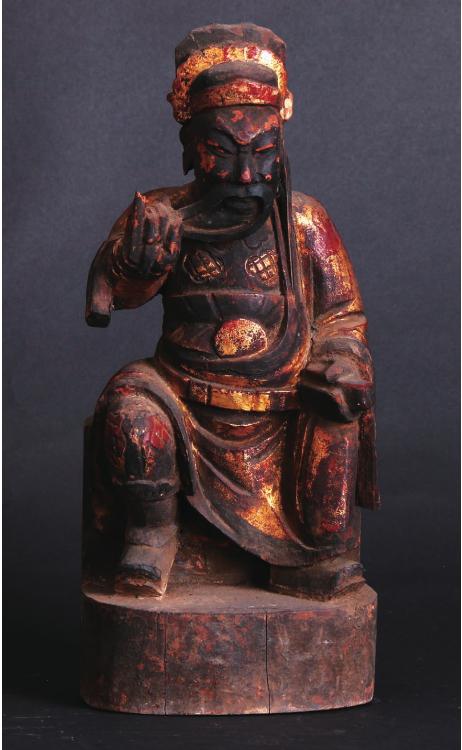 8.金髹关公像。清代文物。通高32.2厘米,像高27厘米,座高5.2厘米,座宽7.9厘米,座长12.7厘米,重805克。木质,器物采用圆雕方式雕刻关公坐像,关公左手执书卷,右手拂须。现藏于渝北区文物管理所。