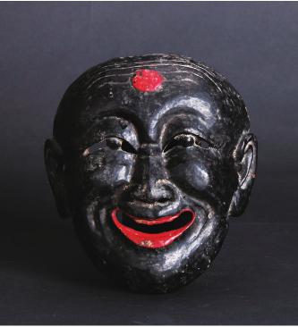 9.人物面具1。清代文物。通高21.2厘米,通宽18.4厘米,厚6.4厘米,重275克。木质,整木雕刻人物面具。面部施黑漆,唇部及额心点缀朱红色漆,五官透通,面带笑容。现藏于渝北区文物管理所。
