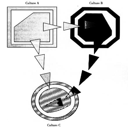 In Figure 1 A,B and C represents three different cultures.Cultures A and B are similar to one another while culture C is quite different.Within each culture is another form similar to the shape of the influencing parent culture.This represents the person who has been molded by his/her culture.However,the shape of the person is somewhat different from that the parent culture since we are all shaped by our culture,but are also influenced by other factors aswell (e.g.age,gender,class,race,etc.).Also,within any culture there is internal variation.