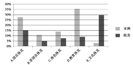 可以看到,留学生在中国生活遭遇的休克主要有语言休克、非语言休克、角色休克、教育休克和文化休克[4]。由于欧美国家与中国的文化差异很大,所以欧美留学生在中国所遭遇的文化休克比亚洲学生更多,这些文化休克主要表现为对中国人价值观、思想形态的困惑不解。另一方面,亚洲学生的语言休克、非语言休克、角色休克及教育休克普遍比欧美学生高,尤其是在教育方面。这一点让人颇感意外。我们认为,这可能与中国不断变革的教育模式有关,同时,对教育、文化不同的认知与理解也会影响留学生对中国教育模式的接受程度。