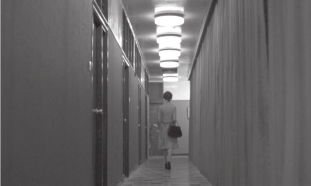 由于全景深镜头形成的复杂画面空间结构具有多层面和多元性,这就使观众在欣赏影片时有相当大的自由选择权,能够对某些画面形象作出自己的判断和理解。在《花样年华》中,摄影机不移动的时候,很少有推拉镜头出现。其实,王家卫对全景深的偏爱都体现在这些固定镜头里,他总是用全景深来描绘电影中最富诗意的画面。因为全景深能以一个单独的镜头表现完整的动作和事件,而其含义不依赖它与前后镜头的联结就能独立存在。比如,苏丽珍走出2046房间的那组镜头。画面一开始就是旅馆深邃的走廊,曲径中一边轻轻的飘着深红色的窗帘,天花板上一字排开的灯散发出乳白色的光,在这样幽深的环境下,苏丽珍走出房间。电影拍摄中,一般的画面是镜头跟着一个人走出走廊,然后再下楼梯。但王家卫的选择却不是这样,当行走着的苏丽珍突然停在走廊上时,他让观众的视野停留在了苏丽珍的身上。也许,导演就是想让观众与被摄主体保持一定的距离,似乎是可望而不可即。只有这样,在他们的爱情枯萎的时候,观众的情感落差才不会很大,感觉也不会是特别痛惜,而只是一丝淡淡的忧伤,因为这一切已经在他们的意料之中(图15-6)。