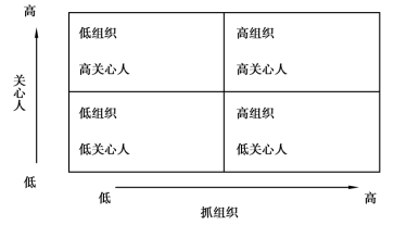 1945年,美国俄亥俄州立大学工商企业研究所的斯多基尔和沙特尔两位教授,主持开展了一项范围广泛的关于领导问题的调查。通过对一千多种刻画领导行为因素的调查归类,将领导行为概括为两大类:“抓组织”与“关心人”。“抓组织”是以工作为中心,指的是领导者为了实现工作目标,既规定了他们自己的任务,也规定了下级的任务,包括进行组织设计、制订计划和程序、明确职责和关系、建立信息途径、确立工作目标等。“关心人”是以人际关系为中心,包括建立相互信任的气氛,尊重下级的意见,注意下级的感情和问题等。根据这两类内容,通过领导行为描述问卷的调查,结果发现:领导者的行为可以用二维空间的“四分图”表示(图8.2)。