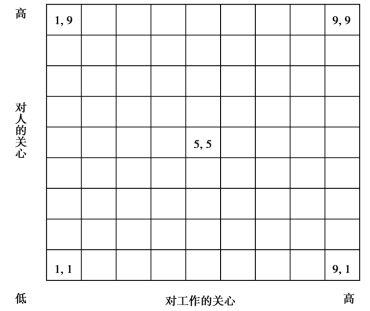 在俄亥俄州立大学领导行为四分图的基础上,1964年,布莱尔与莫顿就企业中的领导方式提出了管理方格图(图8.3),纵轴和横轴分别表示领导者对人和对生产的关心程度。第1格表示关心程度最小,第9格表示关心程度最大。全图总共81个小方格,分别表示“对生产的关心”和“对人的关心”这两个基本因素以不同比例结合的领导方式。在评价领导时,可根据其对生产的关心程度和对员工的关心程度,在图上寻找交叉点,这交叉点就是他的领导倾向的类型。