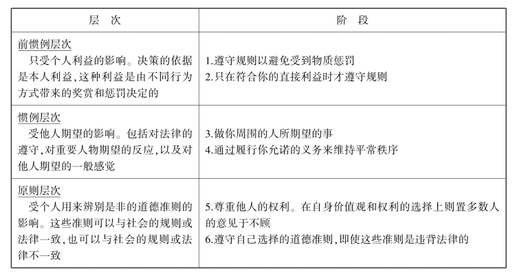 道德发展的最低层次是前惯例层次,在这一层次,个人只有在其利益受到影响的情况下才会作出道德判断;道德发展的中间层次是惯例层次,在这一层次,道德判断的标准是个人是否维持平常的秩序并满足他人的期望;道德发展的最高层次是原则层次,在这一层次,个人试图在组织或社会的权威之外建立道德准则。