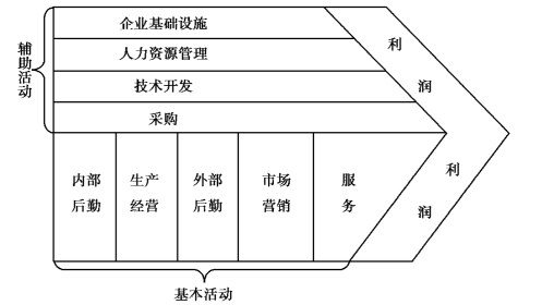 按价值活动的工艺顺序,基本活动由五个部分构成:①内部后勤:包括与接收、存储和分配相关的各种活动;②生产经营,包括与将投入转化为最终产品形式相关的各种活动;③外部后勤,包括与集中、存储和将产品发送给买方有关的各种活动;④市场营销和销售,包括与传递信息、引导和巩固购买有关的各种活动;⑤服务,包括与提供服务以增加或保持产品价值有关的各种活动。每种基本活动可以进一步细分或组合,有助于企业内部分析。