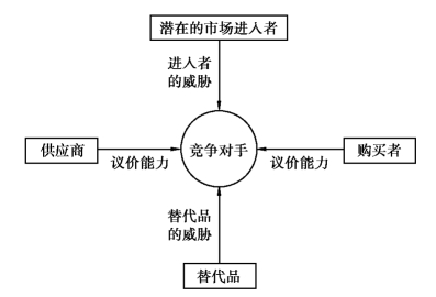 (5)供应商的讨价还价能力研究。其影响因素主要有:①要素供应方行业的集中化程度;②要素替代品行业的发展状况;③本行业是否是供方集团的主要客户;④要素是否为该企业的主要投入资源;⑤要素是否存在差别化或其转移成本是否低;⑥要素供应者是否采取“前向一体化”的威胁。