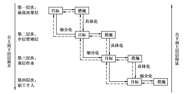 目标管理中的目标不能完全由高层管理人员制定然后再分派下去,下级人员应积极参加目标的制定和实现过程。首先确定总目标,然后对总目标进行分解,逐级展开,通过上下协商,制定企业各部门、各车间直至每个员工的目标;用总目标指导分目标,用分目标保证总目标,形成一个“目标—手段”链。