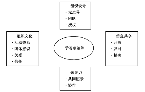 在学习型组织中,员工通过不断获取和共享新知识,参与到组织的知识管理中来,并有意愿将其知识用于制定决策或做好工作。学习型组织的特征主要表现在组织设计、信息共享、领导力及组织文化等方面。概括地讲,信息共享和工作协作要求组织设计采用团队和授权方式,组织的学习要求信息共享公开、及时、准确,组织的学习要求领导者以促进组织共同愿景和协作氛围的形成为职责,组织的学习还要求培育一种有利于学习的组织文化,如图5.9所示。