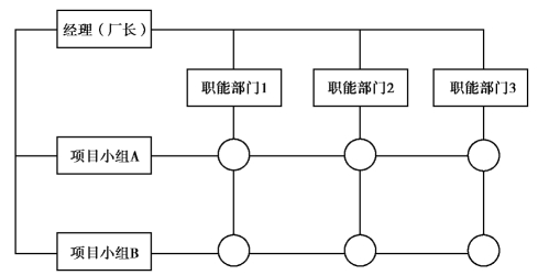 “矩阵”是从数学中移植过来的概念,用以形象直观地说明该组织结构的特点。矩阵制组织结构的基本内涵是,类同于数学中的矩阵,组织结构由纵横两套管理系统组成,一套是按职能划分的纵向领导系统,另一套是为完成某一任务而组成的横向项目系统。在传统的按照职能划分的部门基础上,添加按照任务划分的项目小组的结果,就形成了纵横交错的矩阵结构。项目小组是为完成一定的管理目标或某种临时性任务而设置的,由具有不同专长技能、选自不同部门的人员组成。为了加强对项目小组的管理,每个项目在总经理或厂长领导下由专人负责。小组成员既受项目小组领导,又与原职能部门保持组织与业务联系,受原职能部门领导,如图5.8所示。