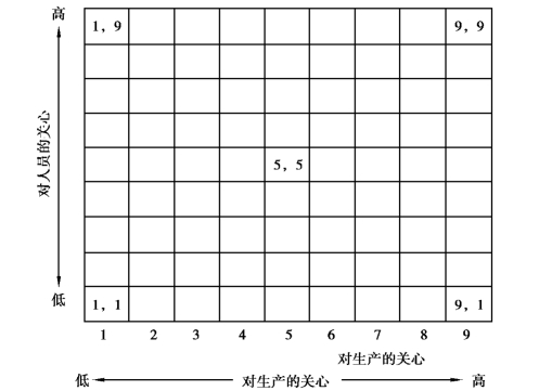 密执安大学和俄亥俄州立大学的研究结果发表以后,引起了对理想的领导行为的广泛讨论。一般的看法是,理想的领导行为既要是绩效型的,又要是关怀型的。对这种理想的领导行为加以综合的重要成果,是美国得克萨斯大学的布莱克(Blake)和穆顿(Mouton)提出的管理方格论。这一理论充分概括了上述两项研究所提炼的员工导向和生产导向维度。在这种领导理论中,首先把管理人员按他们的绩效按照导向行为(称为对生产的关心)和维护导向行为(称为对人员的关心)进行评估,给出等级分值。然后以此为基础,把分值标注在两个维度坐标界面上,并在这两个维度坐标轴上分别划出9个等级,从而生成81种不同的领导类型。