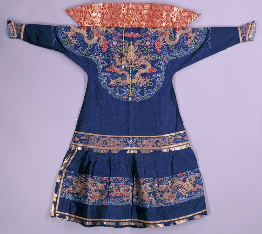 朝袍圆领,大襟右衽,马蹄袖,附披肩,后背及披肩饰明黄绦珍珠青金石背云各一,裾左开。袍以二至三色晕的装饰方法在深蓝色四合如意云纹实地纱地上彩织柿蒂形云龙纹及海水江崖等纹样。领、袖边饰石青色云纹织金缎及三色平金边。领、襟缀铜鎏金錾花扣六。袍内衬蓝色四季花卉纹直径纱里,月白色云纹实地纱袖衬,披肩衬红色团龙如意云纹织金缎里。