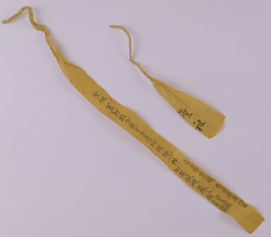 领口系黄纸签,墨书:“圣祖蓝纱织金龙片金边袷朝袍一件,青金石背云一块,青金坠角四个,加间饭块正珠八颗(四等四颗、五等四颗)。”