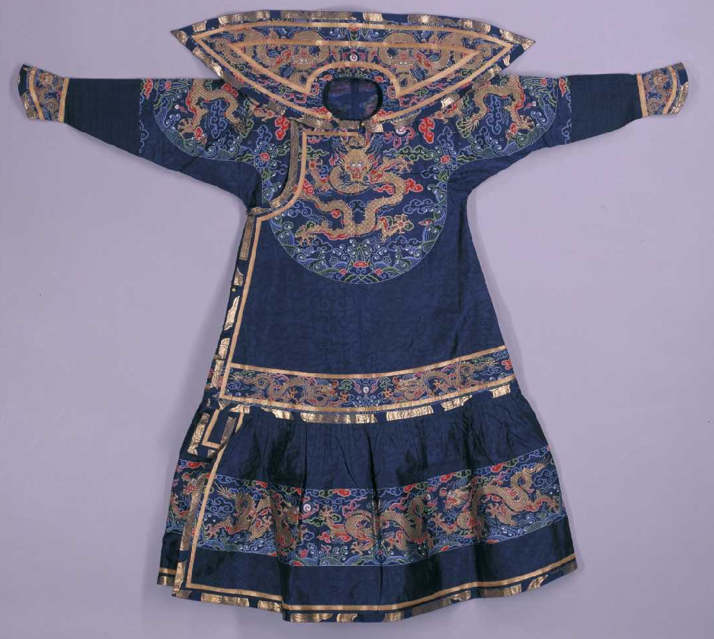 深蓝色云龙妆花纱袷朝袍,清康熙,身长153cm,两袖通长189cm,袖口宽16cm,下摆宽138cm,左开裾长52cm,披肩103-35cm。清宫旧藏。
