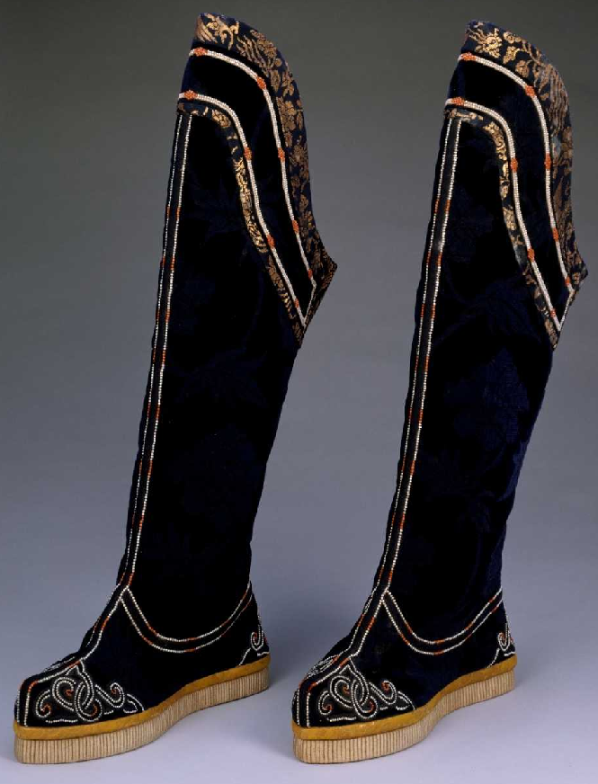 蓝色漳绒串珠云头靴,清康熙,长25cm,高53cm。清宫旧藏。
