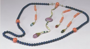 朝珠由108颗青金石珠穿成,有珊瑚结珠四个,上端结珠(亦称分镶)下有小珊瑚佛头相连,佛头有孔,用黄丝带与银镀金托嵌碧玺结牌相接,下有银镀金托嵌碧玺坠角。以珊瑚珠组成纪念三串,坠角分别嵌红、蓝宝石。