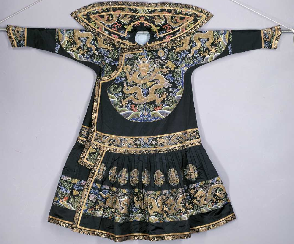 朝袍圆领,大襟右衽,马蹄袖,附披肩,裾左开。袍以二至四色晕的装饰方法在石青色缎纹地上彩织柿蒂形彩云金龙纹及海水江崖等纹样。领、襟镶石青色祥云花卉杂宝织金绸及三色平金边。领、襟缀铜鎏金錾花扣五,披肩扣三。袍内衬湖色缠枝菊暗花绫里,披肩后衬红色团龙杂宝织金绸里。