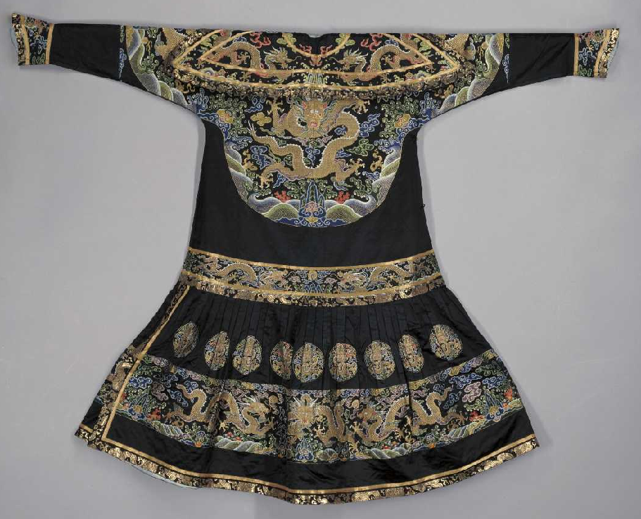 此朝袍为皇帝礼服。其织工精细,石青地色沉稳庄重,更衬托出金彩纹饰的明艳华美,为清雍正朝江宁织造局妆花缎之精品。