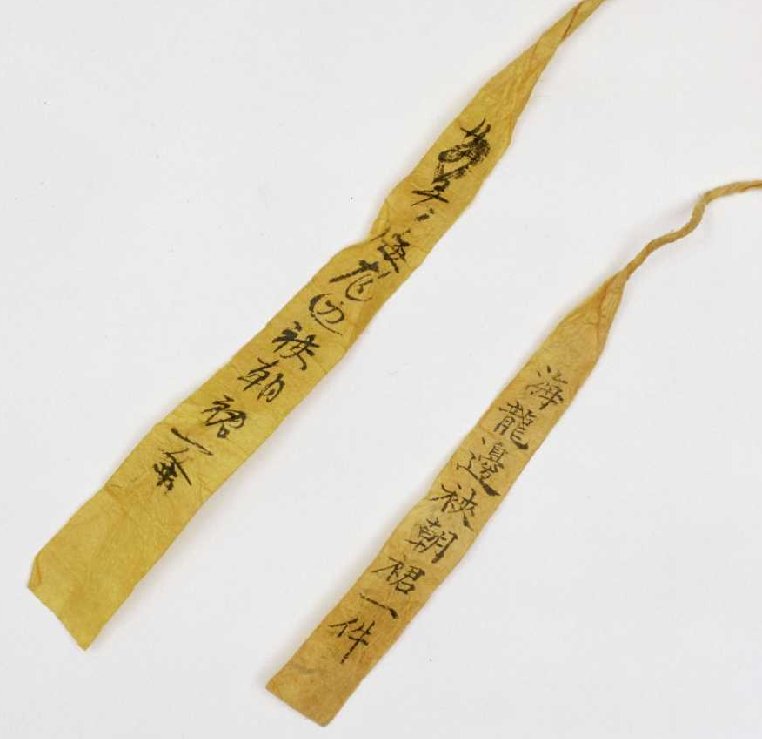 领口系墨书黄纸签,正面书:“海龙边袷朝裙一件”,背面书:“咸丰十年四月初四日收,金环交”。