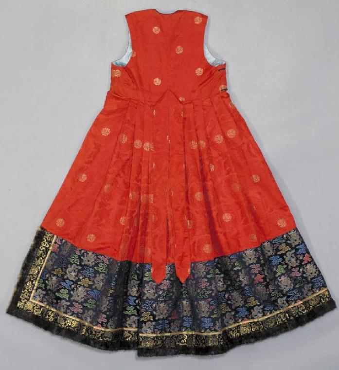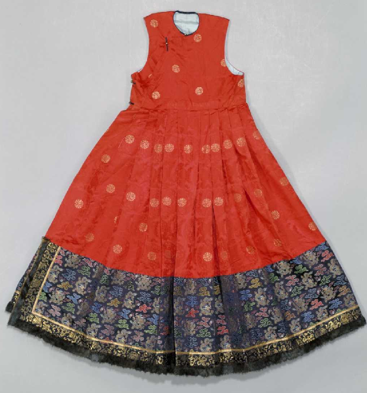 朝裙圆领,大襟右衽,无袖,腰栏作襞积状,上衣下裳相连属,后背垂带二,裾左开。上用红色团龙织金寿字纹间四合如意云纹织金缎,下为石青色寸蟒妆花缎。裙襟缀铜鎏金光素扣四,铜鎏金錾花扣二。裙上部内衬湖色素纺丝绸里,中部为单层,下裳为袷层。下缘饰海龙皮和团龙杂宝纹织金缎及三色平金边。