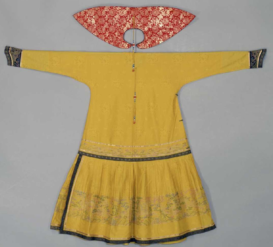 朝袍圆领,大襟右衽,马蹄袖,附披肩,后背及披肩各垂明黄绦,饰珊瑚、珍珠背云,裾左开。袍在明黄色团龙杂宝纹芝麻纱地上用缉线和二色平金的针法缉绣云龙及海水江崖纹样。领袖饰石青色直径纱描金缠枝花卉纹边。领、襟缀铜鎏金錾花扣五,披肩缀铜扣一。月白色实地纱袖衬。