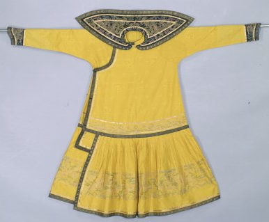 此朝袍为皇帝礼服。其纹饰简练,线条自然流畅,由此可见清代皇帝服饰纹样在不同时期的风格演变。