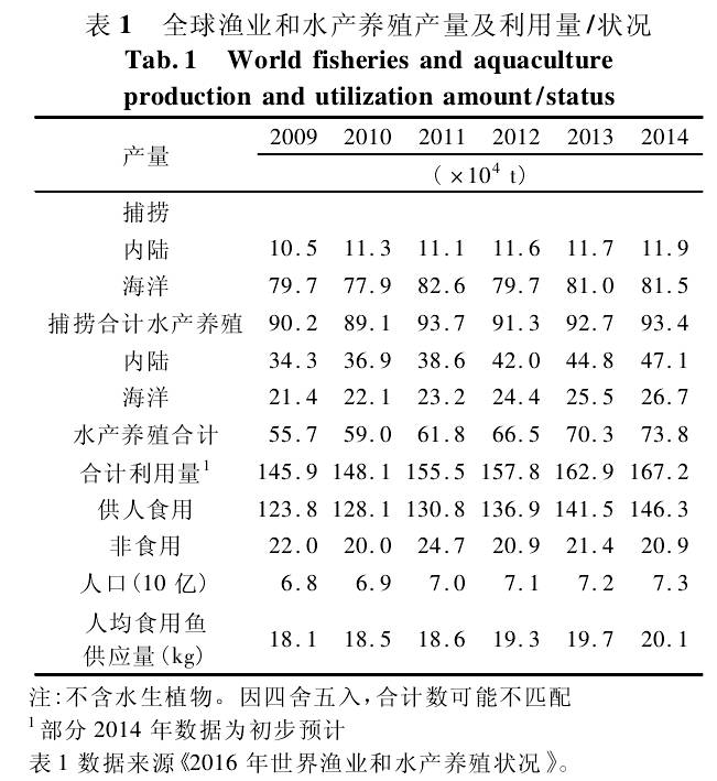 2014 年全球捕捞渔业总产量为9340×104t,其中8150 ×104t 来自海洋水域,1190×104t 来自内陆水域(表1)。