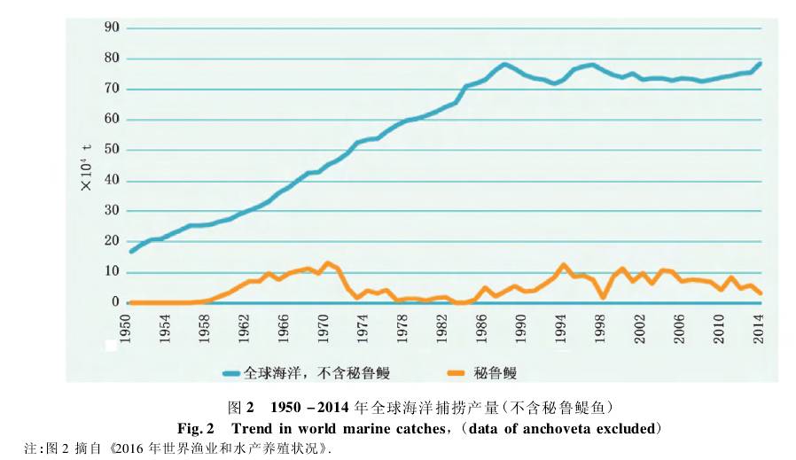 1950 年~1988 年,全球海洋渔业捕捞产量增长较快,不包括秘鲁鳀鱼在内的捕捞产量从 1950年的1800×104t 左右猛增至1988年7800×104t,1988年之后的三十多年中,产量基本保持稳定,2014年的产量为7840×104t,与1988年的产量基本相同。