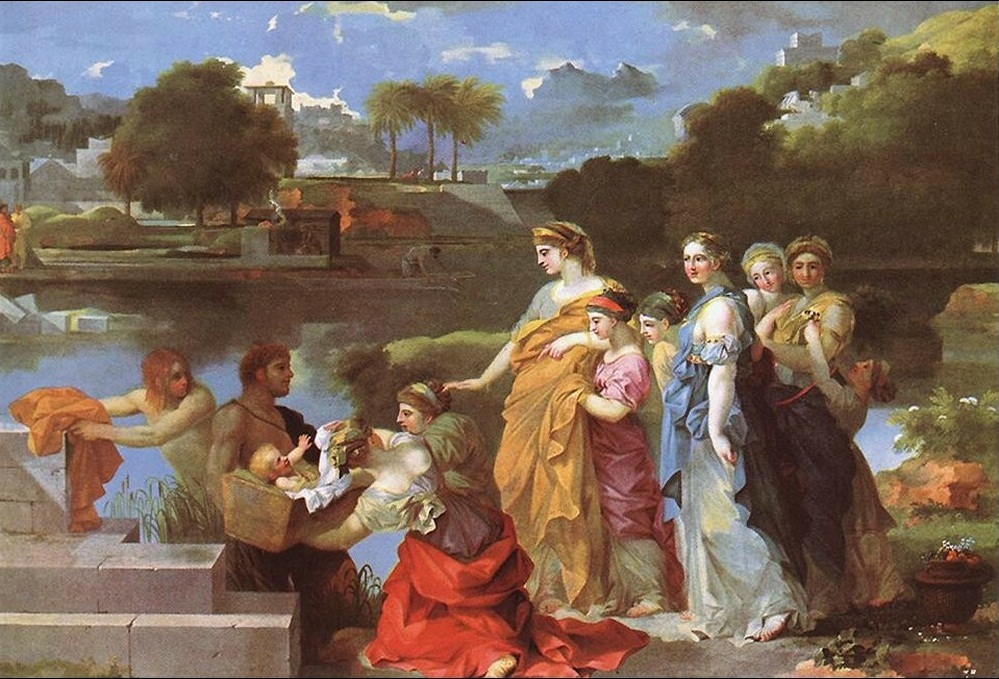 此画故事来源于《圣经》:一个希伯来妇女为了自己的孩子能逃脱法老对希伯来婴儿的屠杀,将他装在蒲草箱中,放在尼罗河滨。法老的女儿恰巧在河边洗澡,救起这个婴儿,收养了他,为他取名摩西。此图中,法老的女儿占据了画的中轴线,她的左边是一群侍女。画中人物造型有一种古代雕塑般的静止感。画面由远及近分为三条平行的视觉层面,带有学院派的风格。而人物的姿态、纯净的光线和生动的色彩对主题的烘托起到了至关重要的作用。