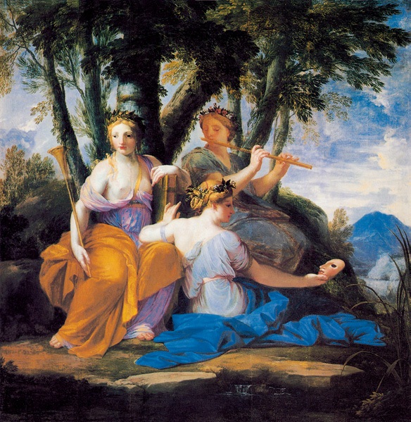 此画是画家的代表作之一,当时曾被用于装饰巴黎兰伯特旅馆的存衣间。画面中是希腊神话中九位缪斯女神里的三位。缪斯女神是宙斯与记忆女神所生,是掌管诗歌、音乐与其他文艺的女神,也是阿波罗的伙伴。画中的三位分别是:掌管历史的克里奥,她的识别物是书、号角;掌管音律及抒情诗的厄代尔普,她的识别物为长笛;掌管喜剧及田园诗的达莉,她的识别物为面具。画面洋溢着浓郁的古典主义风格,柔和的色彩透射着迷人与精致的气息。