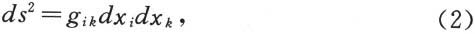 式中的指标应从1记到4。这些gik形成一个对称张量。如果对场(1)进行一次变换以后,gik关于坐标的一阶导数不等于零,那么在上述考查中对于这个坐标系来说,就存在着一个引力场,而且是一个十分特殊的引力场。多亏黎曼对n维度规空间所作的研究,这种特殊的场总是能够表征为: