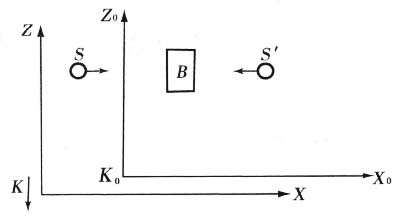 的辐射S和S′分别沿着正的和负的x0方向在运动着,最后都被B吸收了。由于这种吸收,B的能量增加了E。因为对称的缘故,物体B对于K0仍然是静止的。