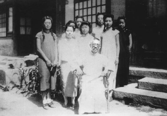 1943年与顾随先生(前坐者)及同学在顾家合影(后排右二为叶嘉莹)
