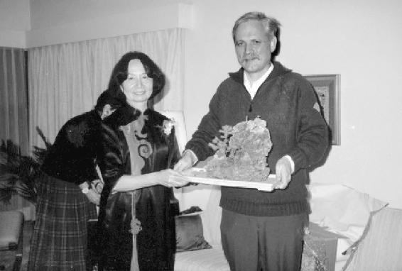1989年退休时,在退休会上由学生施吉瑞(右)致送纪念品