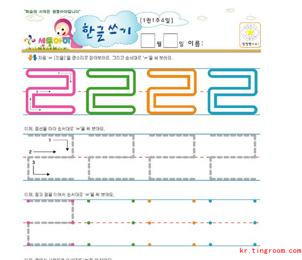 这次的ㄹ比较复杂,共由三划组成,大家注意写出棱角,不要写成阿拉伯数字的“2”。好了,拿起你的笔跟着箭头练一练吧。