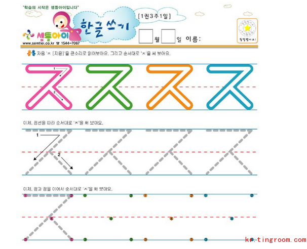 今天的ㅈ虽然看上去有点麻烦,不过写起来实际只有两画。值得注意的是这个辅音是韩语中少数手写体和印刷体不一样的,两种样子都要认得哦。好了,拿起你的笔跟着箭头练一练吧。