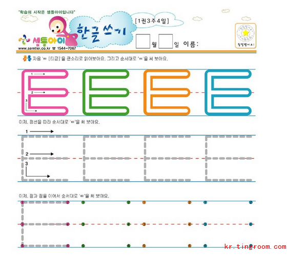 今天的ㅌ是ㄷ的送气音,书写方法是在ㄷ中加上一横,和英文的E很像,书写时要注意笔画顺序,跟着箭头拿起你的笔练一练吧。