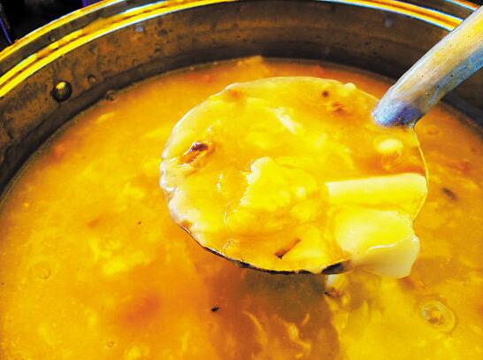镬(huò)边糍是斗门尤其是农村地区的特色美食。将粘米粉用凉开水开浆,搅拌时慢慢加水使粉浆由稠到稀,然后烧镬,下油盐、配料(可加虾米、鱩干、腊肉、葱花等,一般农户多用番薯、芋粒等作配料)一起炒香,放汤煮沸后,边煮边用勺子舀粉浆,沿镬边慢慢放入,待这一层粉浆渐渐凝固后,便用镬铲铲到镬中的汤里继续煮,然后又在镬边濑上一层。如此反复,直至所调的粉浆用完。