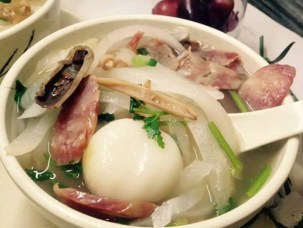 糖包圆是将糯米粉用温水和成粉团,分成适量大小的等份。用刀在黄糖上面画上格子,切成适量大小的方粒黄糖作馅用。然后把小糯米团用手搓圆、按扁,里面放一块黄糖粒,再把小粉团包起来,再搓圆。放入开水煮至浮起即熟。最后用白萝卜、虾米、鱩干、腊肠等配料煮成咸的上汤,兑入汤圆即可食用。其实,就是市面上的汤圆,只是做法和用料特别,乾务人把它叫做“糖包圆”。