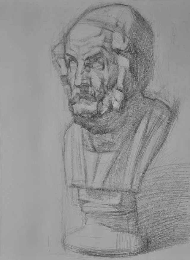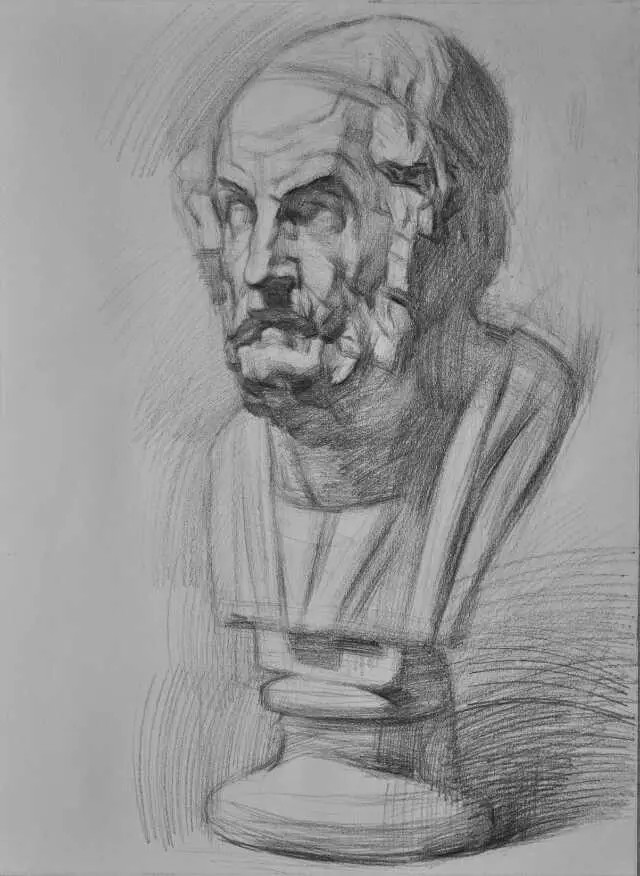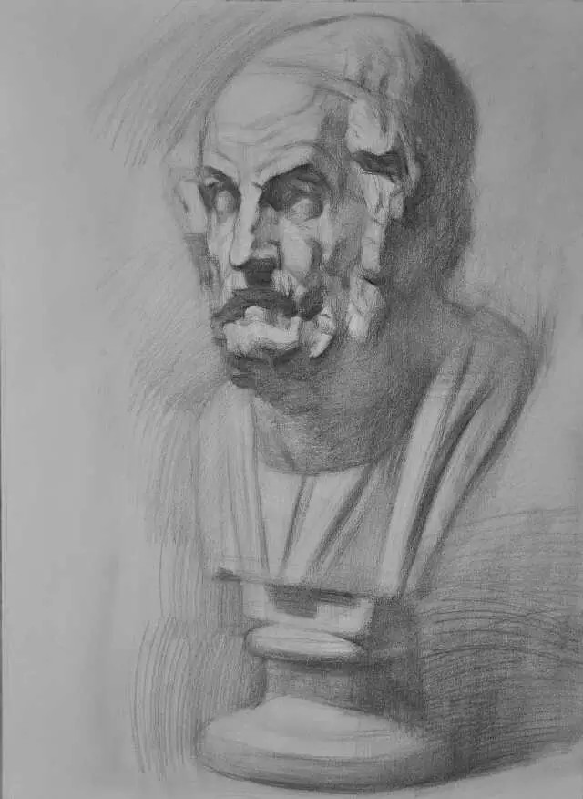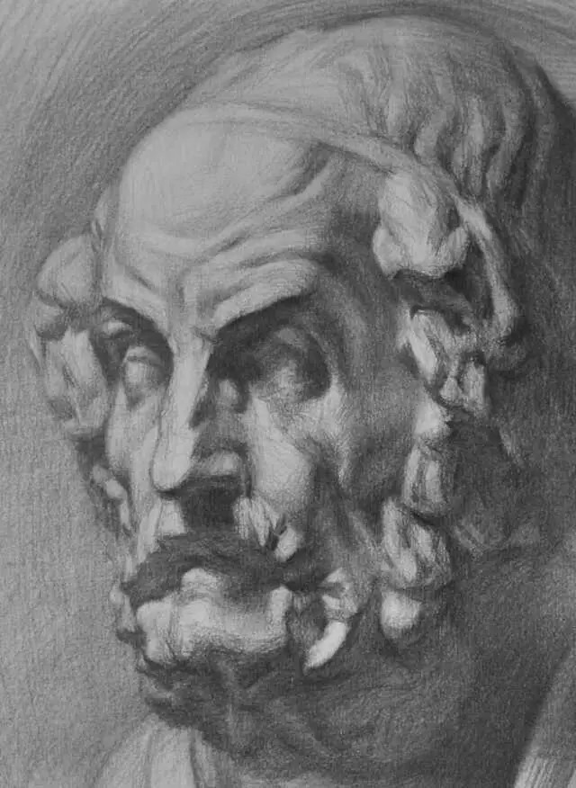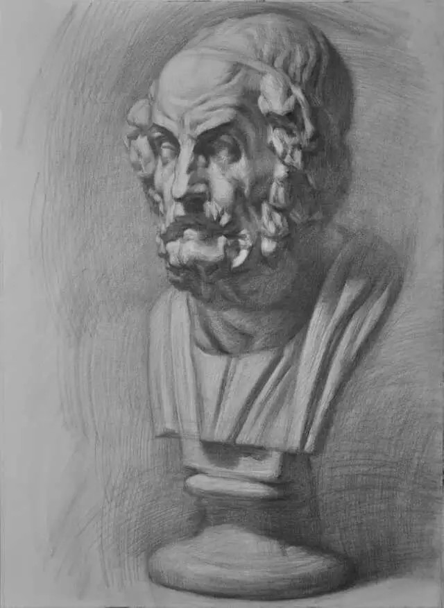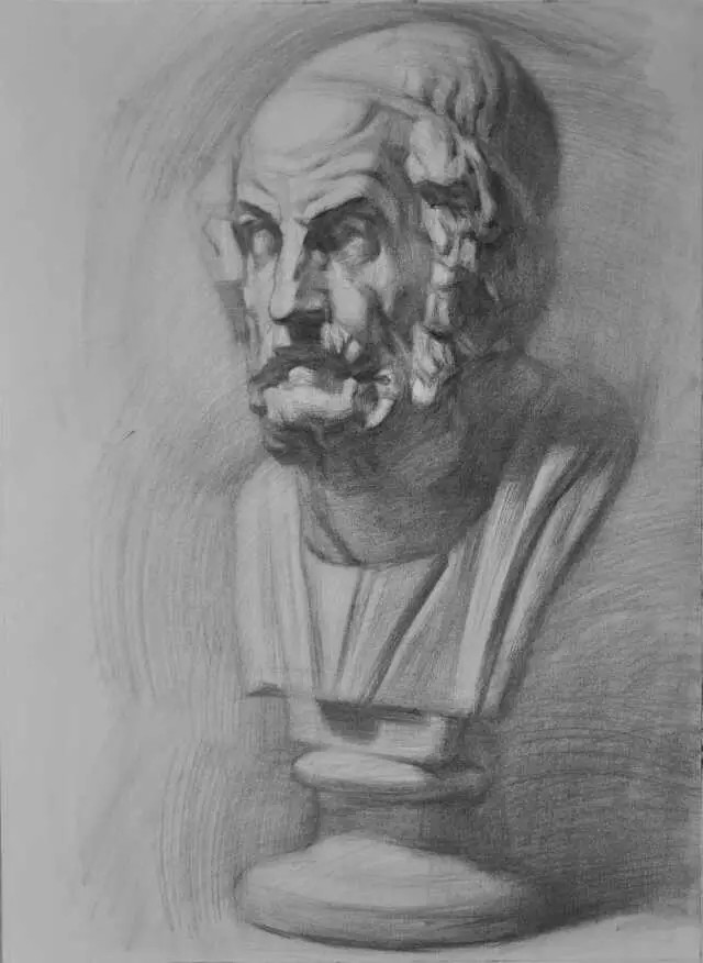 第一张是照片,第二张为起稿图,然后大刀阔斧的一步步进行。从大形大面一层层推着画,稳而不乱。最后的效果很整,是非常优秀的范画,适合学习临摹。