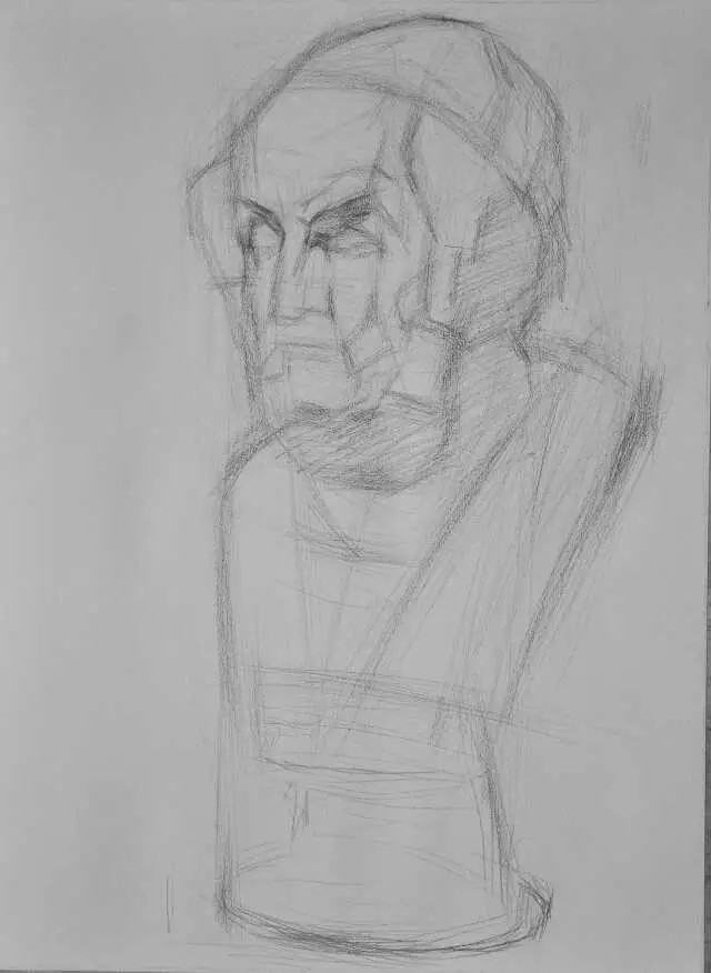 起稿打形,画出大轮廓线,找准比例和透视关系。多将各个点联系起来比较,画的线虚一些,方便后面修改或遮盖。同时将暗面用铅笔的侧锋整体铺出来。