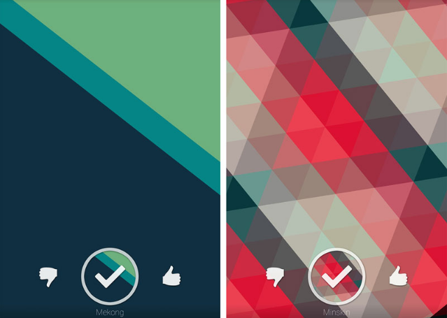 Tapet 只有一个界面,单指滑动可以完成所有壁纸的创作。向不同方向滑动,可以实现颜色、图案的更改。另外,可以对壁纸点赞或者踩,让 Tapet 更了解你的喜好。