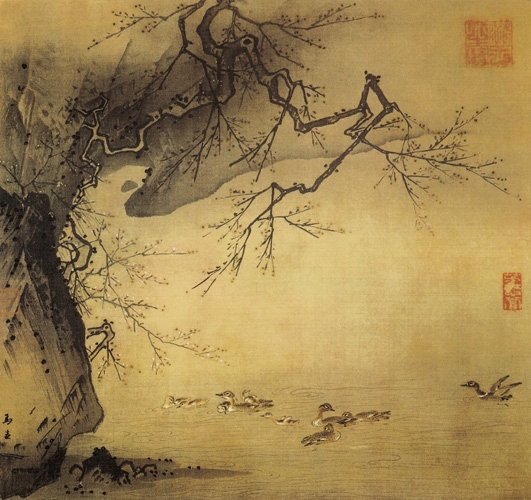 此画绘梅枝斜出石上,水中有群凫飞集浮泳。剪裁、构图新巧。有款“马远”二小字。所绘梅枝刚劲曲折,又有力度,用焦墨勾勒的树干,显得“瘦硬如屈铁”。山石用大斧劈皴,坚实、爽朗而有力。水波绘制出动意,表现迂回、盘旋以及由微风吹起的微波,画得十分动人。此图属于所谓“江湖小景”的小景画范围。