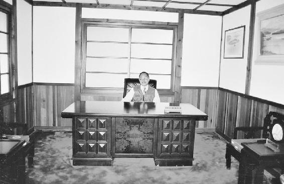 于是,总台小姐派人打开尘封已久的纪念馆,让我参观。一进纪念馆,迎面便见到蒋介石、蒋经国在涵碧楼的大幅照片。蒋介石在台湾有10个行馆,他最喜欢的行馆便是涵碧楼。纪念馆里按照当年的原样,复原蒋介石在涵碧楼的办公室。据说,内中的桌椅都是原物,清一色红木家具。那红木太师椅上,铺着大红绣金缎垫。