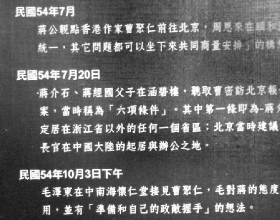 民国五十四年(引者注:即1965年)7月20日,蒋介石、蒋经国父子在涵碧楼,听取曹密访北京报告,形成一个与中共关系和平统一中国的谈判条款草案,当时称为“六项条件”。其中第一条即为蒋介石仍为中国国民党总裁,可携旧部回大陆,也可以定居在浙江省以外的任何一个省区;北京当时建议以江西庐山做为蒋介石的“汤沐邑”,意即台湾最高长官在中国大陆的起居与办公之地。