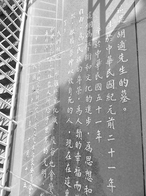 我细读着胡适墓前、用金字刻在黑色大理石上的墓志铭,见到末尾署:“中央研究院胡故院长适之先生治丧委员会立石 中华民国五十一年十月十五日”。