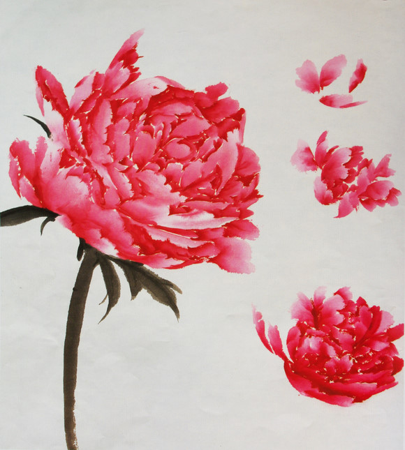 若花瓣向上,则将笔尖朝下,笔根朝上,以侧锋横卧,一笔或两笔画成,画小瓣时,用笔尖笔肚着纸即可。画大花瓣时,笔要一揿到底,利用笔肚笔根的动作,使笔根上的淡红体现在瓣端,自然形成花瓣的浓淡效果。画多瓣时,运用蘸色的深浅,按花的结构层层点出,自然生动。