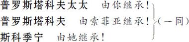 普罗斯塔科夫太太 “您自己念念?”不行,小姐,谢谢老天爷,我没受过那么大的教育。我光会收信。说到念信的事,我总叫别人念给我听,(对丈夫)念一遍。