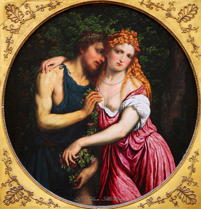 这幅画《虚构的夫妇》mythological Couple,可能是宗教故事或神话中的一对夫妻或其他关系,无法确定是什么人物。色彩和风格非常符合十六世纪中期威尼斯绘画的特征。此画1794年法国大革命期间,从旁提耶夫公爵家族收藏没收。作者帕里斯.博尔东(Paris BORDON,1500-1571),出生于意大利特雷维索,后迁往威尼斯,文艺复兴时期威尼斯画家。据瓦萨里记载,帕里斯.博尔东曾短时间和提香共同学徒,但关系不是很好。瓦萨里可能还见过晚年的博尔东。1538年,博尔东还受弗朗索瓦一世之邀去过法国。