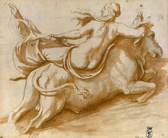 朱利奥-罗马诺,又称朱利奥-皮皮(GIULIO ROMANO, Giulio Pippi)1492年生于罗马,1546年卒于曼托瓦,诱拐欧罗巴,鹅毛笔褐色墨水,褐色晕擦。2004年收归国有,现藏于里尔美术博物馆。