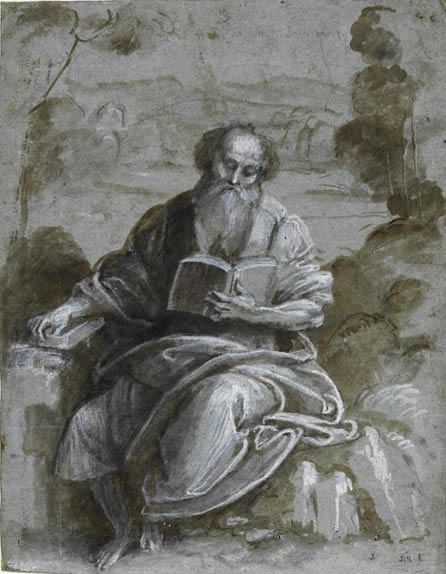 贝纳迪诺-拉尼诺(Bernardino LANINO)约1512年生于莫塔纳(维琴嚓),1583年卒于维尔切利。坐在树林中的福音传教者,鹅毛笔,褐色墨水,白色水粉突出画面明亮出部。2004年收归国有,现藏于卢浮宫书画印刷部。